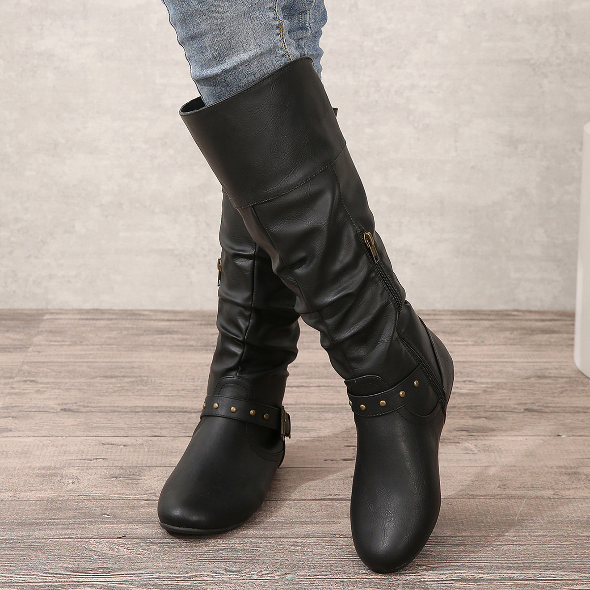 - Product Code: Retro-cuff Leather Belt-buckle Round-toe Womens Boots